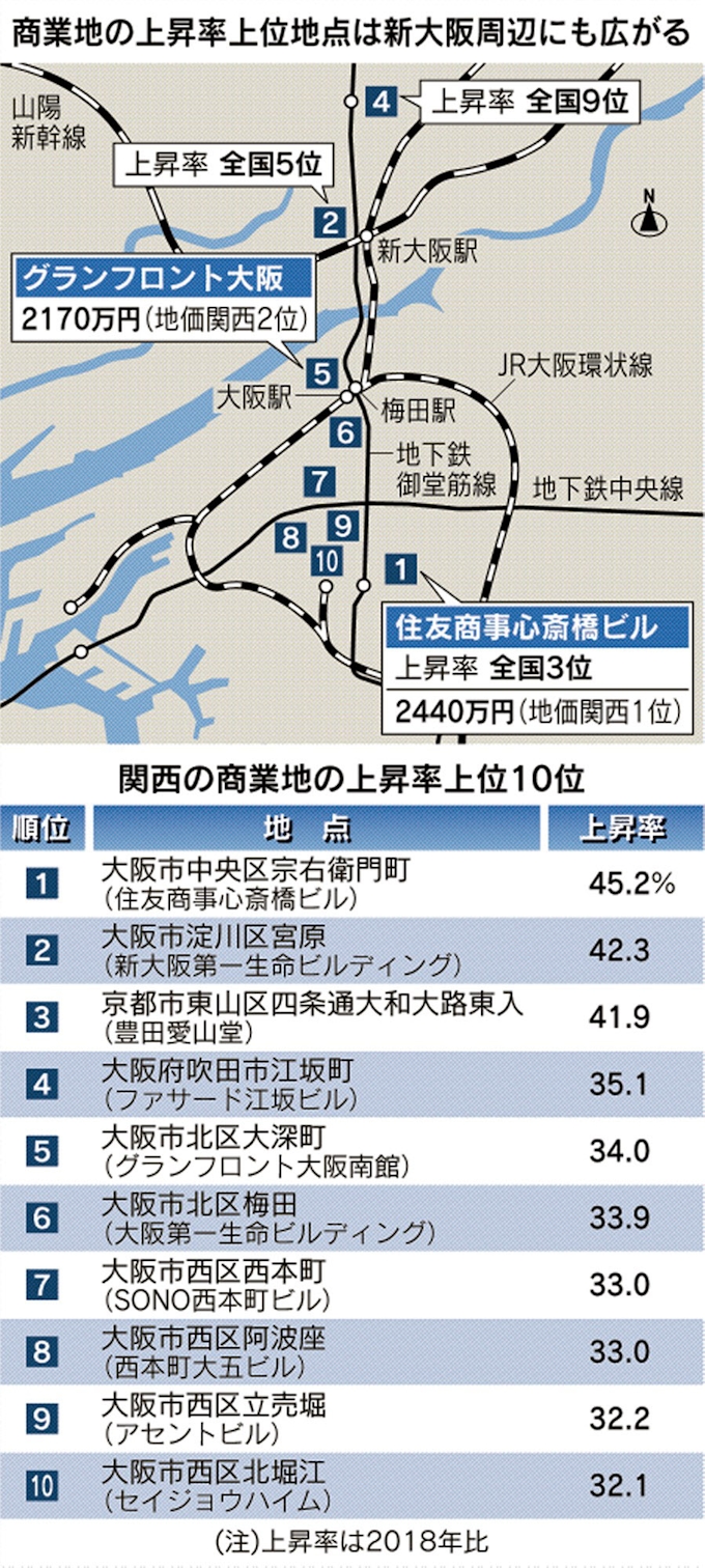 けんたろう V Twitter 令和元年の商業地基準地価ランキング 大阪からはクリサス心斎橋とグランフロント大阪が6位と7位にランクイン 2地点がランクインするのは23年ぶり 特筆すべきは上昇率の高さ 2地点とも一気に新宿を抜くとはねぇ